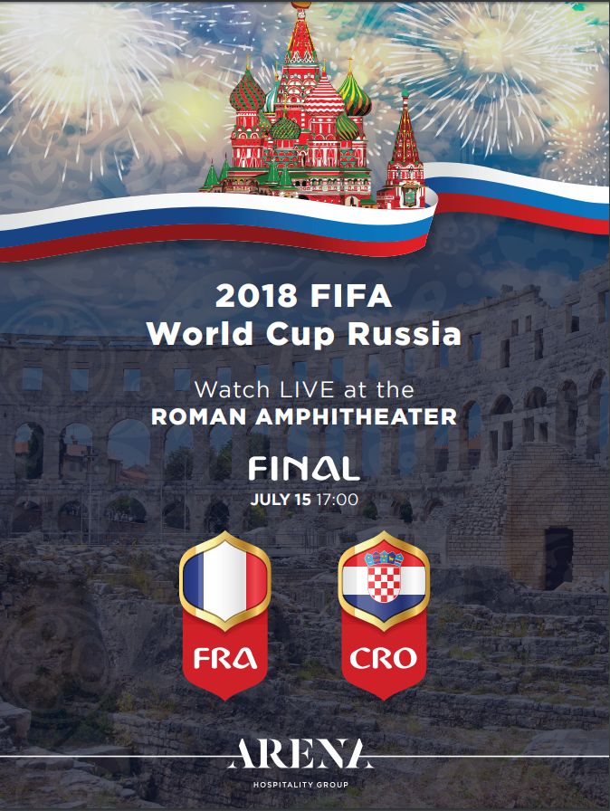 Ovim putem zahvaljujemo se našim nogometašima na ukazanom povjerenju i želimo im da nas u Rusiji odvedu do kraja. Kao poklon navijačima i svima onima koji su od početka bodrili našu reprezentaciju Grad Pula u suradnji sa Pula Film Festivalom organizira gledanje finalne utakmice svjetskog prvenstva u Areni na velikom ekranu.