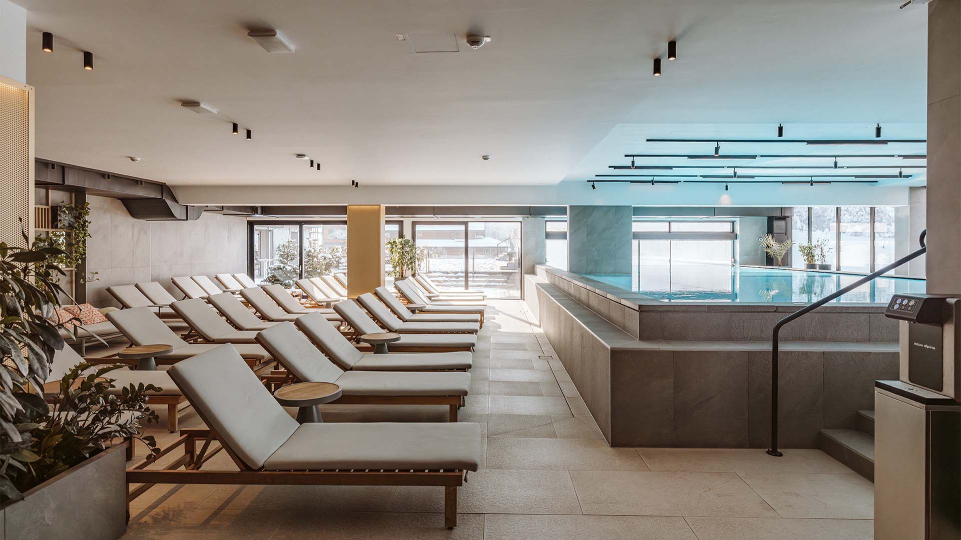 Bergskigebiet mit komfortablen Designermöbeln, warmen Farben, brillanten Betten und großen Fenstern