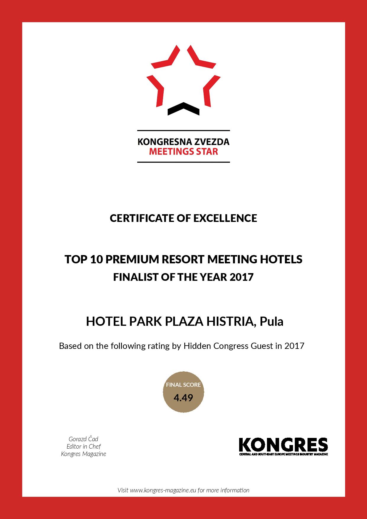 Park Plaza Histria Pula awarded as the finalist in the category "TOP 10 PREMIUM RESORT MEETING HOTELS"